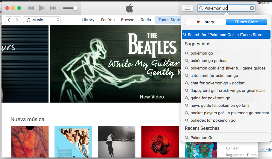 Luego en el buscador, seleccionas nuevamente iTunes Store y escribes una aplicación — como por ejemplo — Pokémon Go, seleccionas en la columna derecha «Apps para iPhone».
