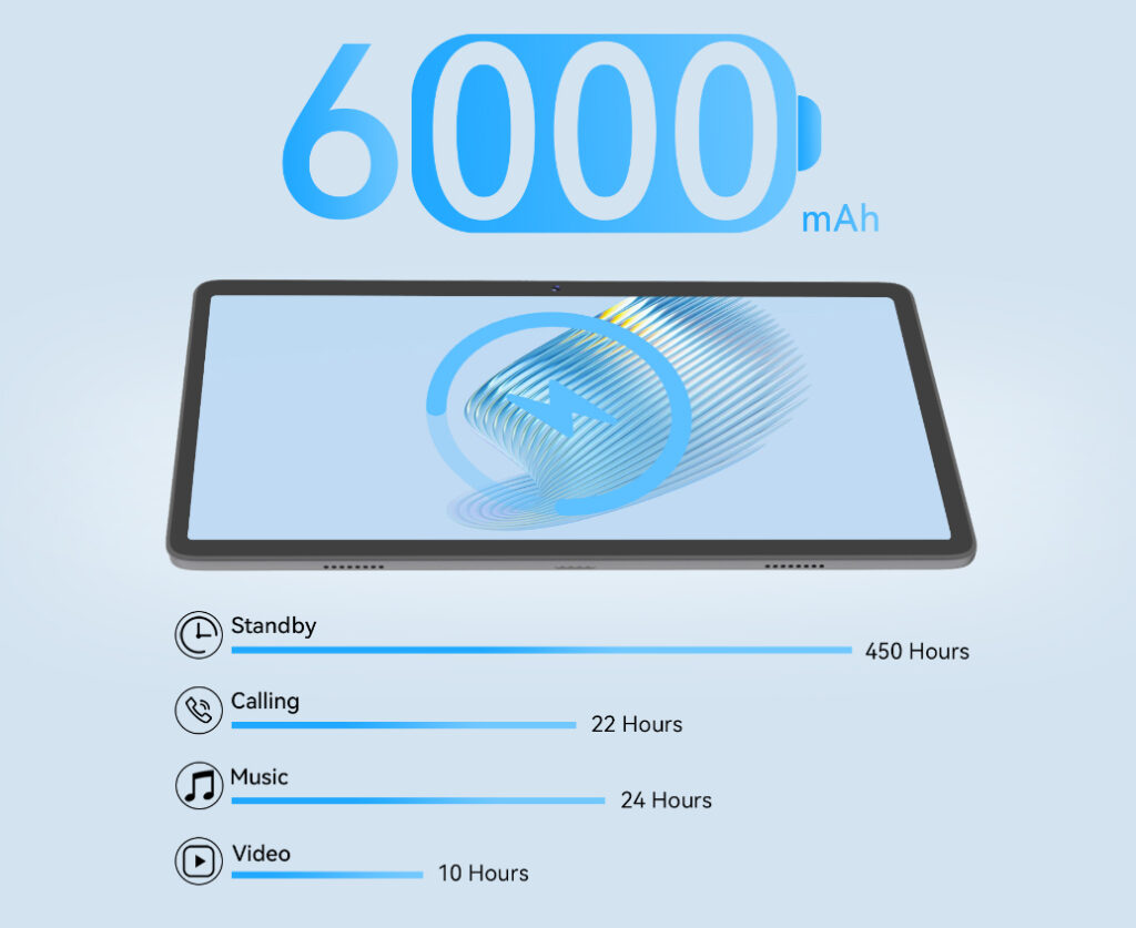 La batería de 6.000 mAh presagia gran autonomía. Ofrecería hasta 450 horas en modo standby. O brindaría hasta 22 horas en llamadas, o 24 horas en reproducción de música o 10 horas continúas de video. La pila carga a 10 W. Por cierto, la tableta ejecuta Android 13 de fábrica.