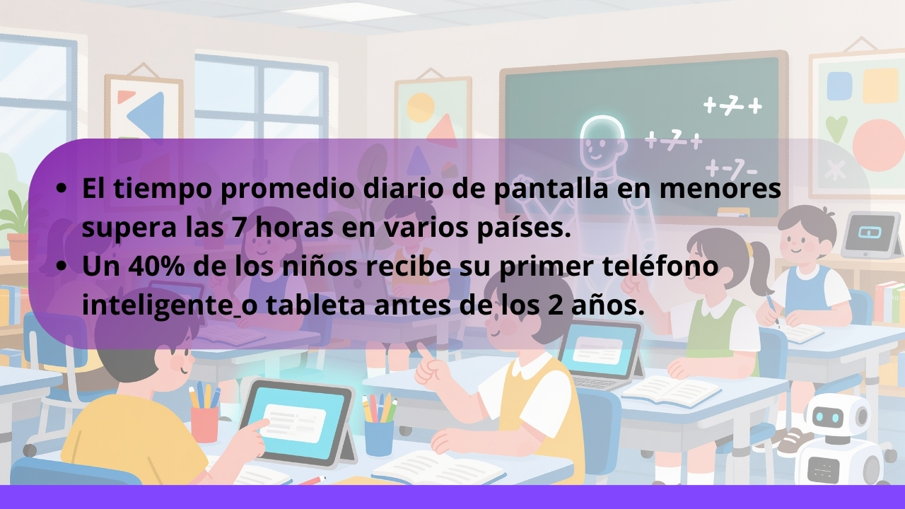 - El tiempo promedio diario de pantalla en menores supera las 7 horas en varios países.
