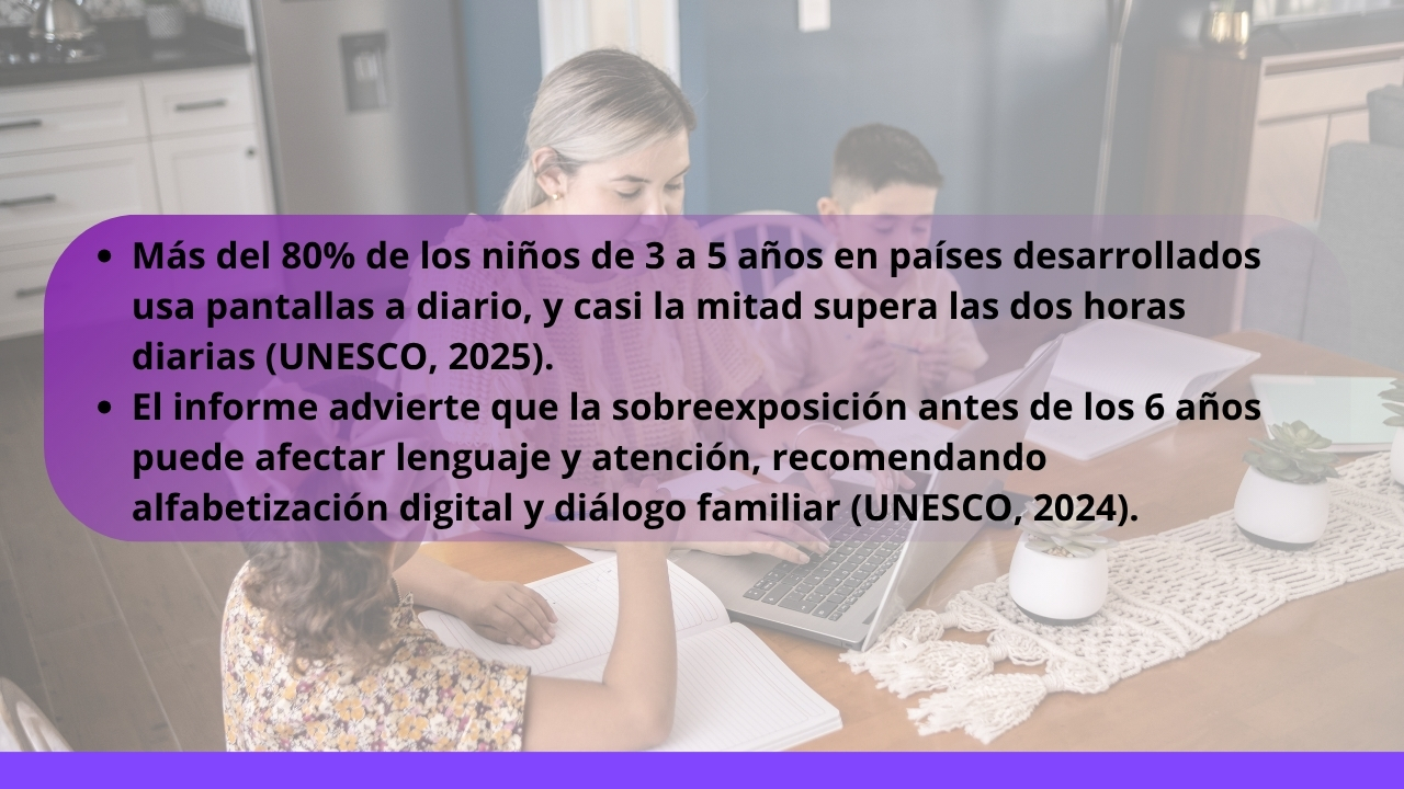 - El Informe de UNESCO advierte que la sobreexposición a pantallas en menores de 6 años puede afectar el desarrollo del lenguaje y la atención, recomendando alfabetización digital y diálogo familiar (2024).