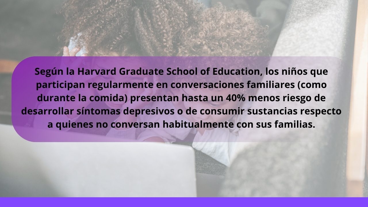 - Según la Harvard Graduate School of Education, los niños que participan regularmente en conversaciones familiares (como durante la comida) presentan hasta un 40% menos riesgo de desarrollar síntomas depresivos o de consumir sustancias respecto a quienes no conversan habitualmente con sus familias.