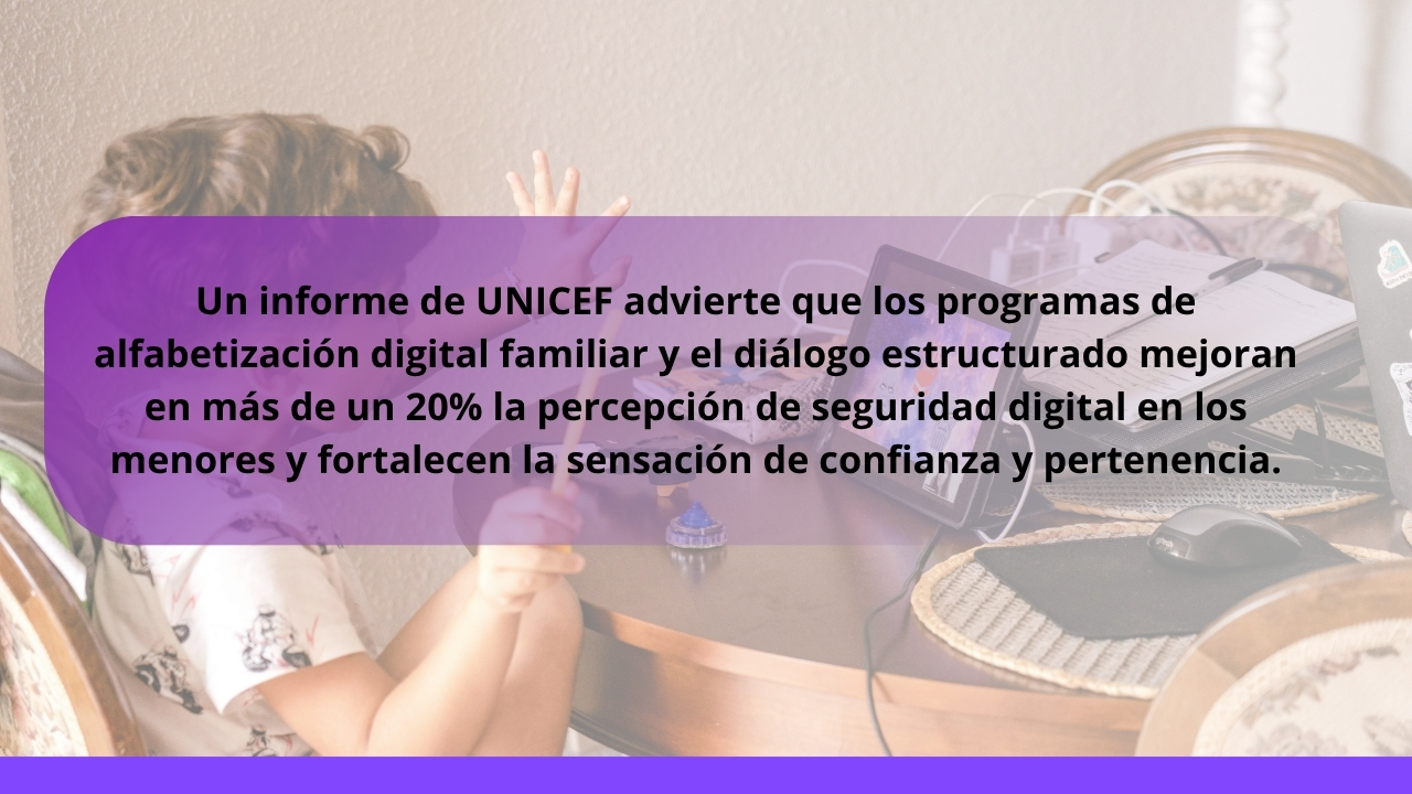 - Un informe de UNICEF advierte que los programas de alfabetización digital familiar y el diálogo estructurado mejoran en más de un 20% la percepción de seguridad digital en los menores y fortalecen la sensación de confianza y pertenencia.