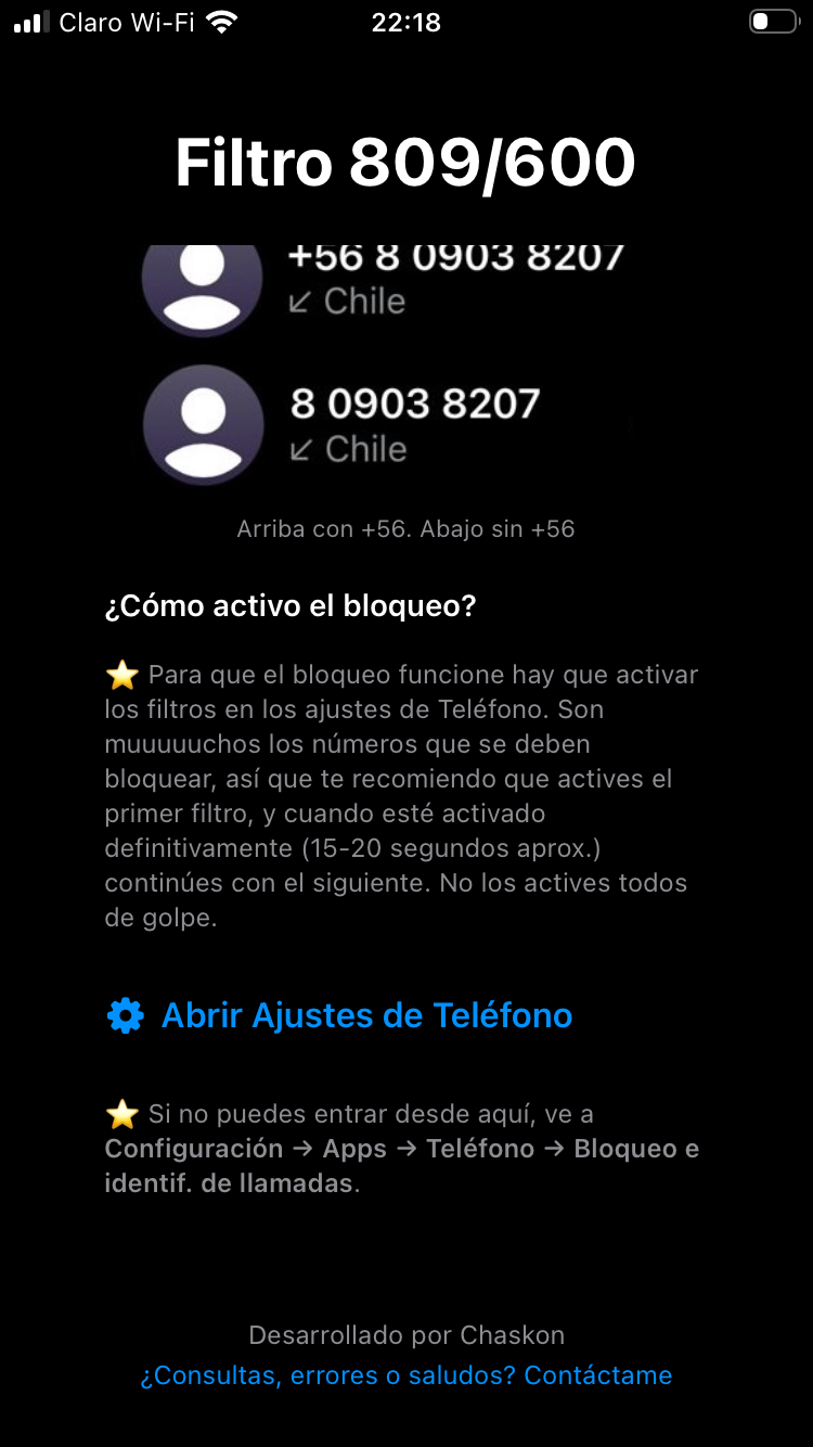 Por suerte hay personas tan inteligentes y buena onda como el desarrollador chileno Cristian Ramirez, quien creó una aplicación para iPhone que bloqueará todas las llamadas de los números 809 y 600 sin excepción alguna, y además es completamente gratuita y libre de anuncios.
