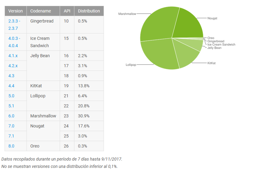 La distribución que corresponde al mes de octubre muestra que la última versión del sistema operativo de Google se encuentra instalado en el 0.3% de dispositivos totales, algo lógico si pensamos que de todos los fabricantes, sólo Sony, Huawei y HMD lograron poder llevar Oreo a su dispositivos antes de que termine el mes.
