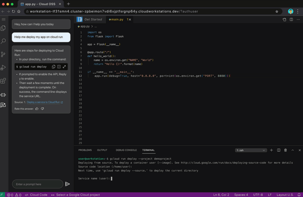 De igual forma, Duet AI también se integra a Google Cloud, con una herramienta similar a Github Copilot: la capacidad de generar código a través de un prompt que nosotros le entreguemos. Pero también será capaz de prestarnos asistencia con cualquier tipo de pregunta que tengamos sobre programación o sobre la nube, facilitando así el proceso de tener que buscar en StackOverflow información en la web.