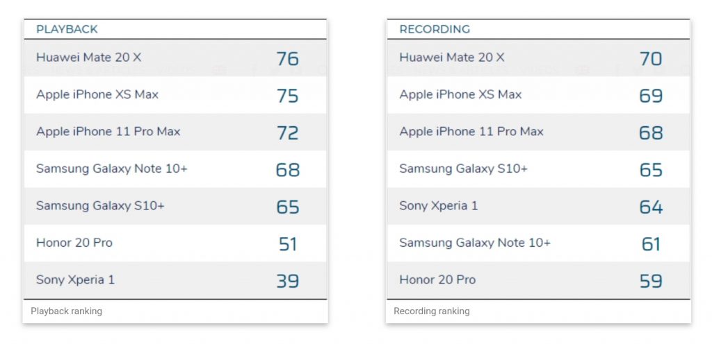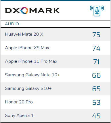 La prueba se llama DxOMark Audio Test Protocol y en esta primera vez evaluaron los equipos Huawei Mate 20 X, iPhone Xs Max, iPhone 11 Pro Max, Samsung Galaxy Note 10+, Samsung Galaxy S10+, Honor 20 Pro y Sony Xperia 1.