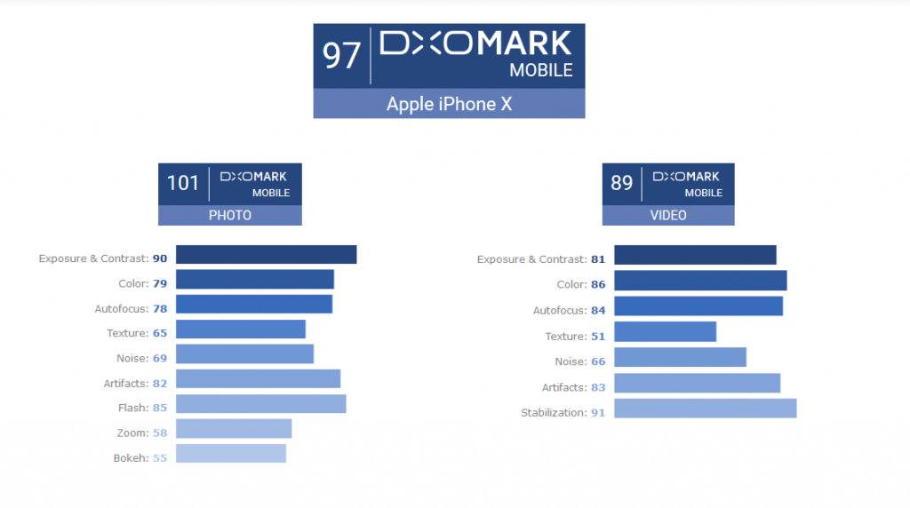 En el modo video, en tanto, el dispositivo anota 89 puntos, donde lo que más afectó su puntaje es la toma de videos con condiciones de poca luminosidad, y que lo hacen perder puntos, siendo superado por el Pixel 2 de Google y el Mate 10 Pro de Huawei también. De este modo, el iPhone X bien podría ser el mejor smartphone para fotografías en la actualidad, pues en ese apartado obtiene 101 puntos, dejando al Mate 10 Pro con 100 puntos y el Pixel 2 con 99 puntos en los peldaños de más abajo.