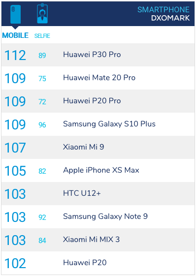 De de esta manera el Huawei P30 Pro se lleva el primer lugar del ranking con 112 puntos, y en el segundo lugar tenemos un triple empate, ya que este lugar lo comparte el Mate 20 Pro, P20 Pro y el Samsung Galaxy S10+ con 109 puntos, mientras que en el tercer lugar vemos al Xiaomi Mi9 con 107 puntos, seguido por el iPhone XS Max que ocupa el cuarto lugar con 105 puntos.