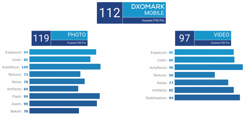 En el apartado de video nos llevamos otra sorpresa, ya que el Huawei P30 Pro obtuvo 97 puntos que no es para nada de mal, pero nos llama mucho la atención que el Huawei P20 Pro obtuvo 98 puntos, cuando se «suponía» que el P30 Pro grabaría mucho mejor los videos. Eso tendremos que probarlo cuando se realice el review.