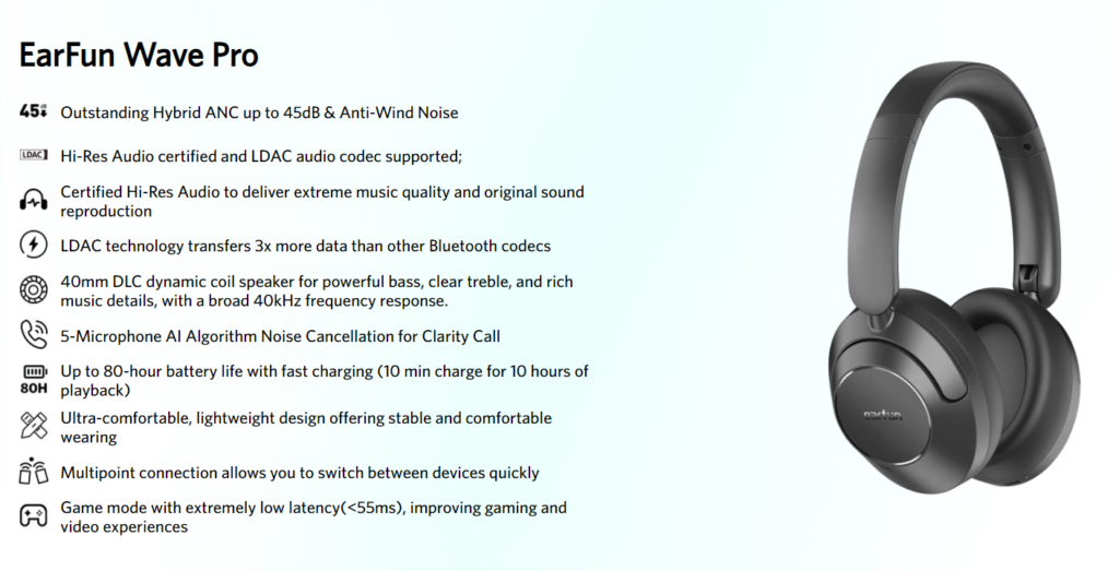 Así, los Wave Pro pretenden ofrecer una experiencia de gama alta sin un precio de gama alta. Los auriculares Bluetooth son compatibles con LDAC, lo que abre la puerta a transmisiones inalámbricas de audio de alta resolución ricas en detalles. También cuentan con cancelación de ruido activa híbrida de 45 dB, con el objetivo de ofrecer una experiencia de escucha sin distracciones.
