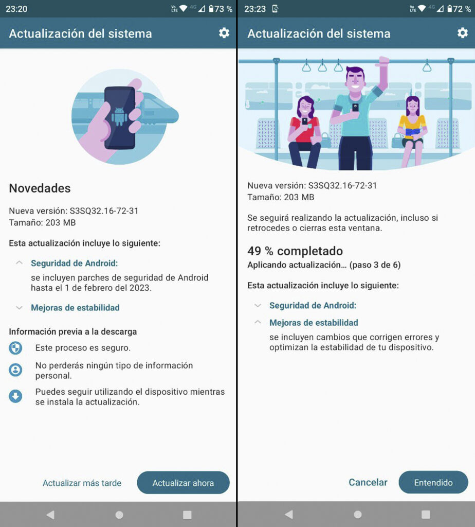 El update tiene el número de versión de firmware S3SQ32.16-72-31. Las novedades implementadas consisten en dos puntos: seguridad y mejoras de estabilidad. Con respecto a la seguridad, abarca al parche de marzo como tal. Y sobre las mejoras de estabilidad se indica: «se incluyen cambios que corrigen errores y optimizan la estabilidad de tu dispositivo».