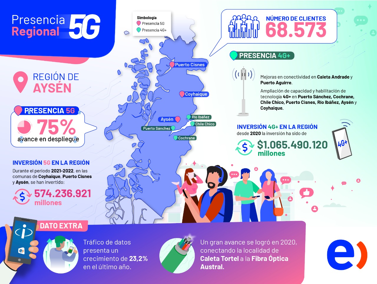 También se suman las mejoras realizadas a la red 4G+ que se efectuaron durante el año 2021 en Puerto Sánchez, Cochrane, Caleta Andrade y Puerto Aguirre.