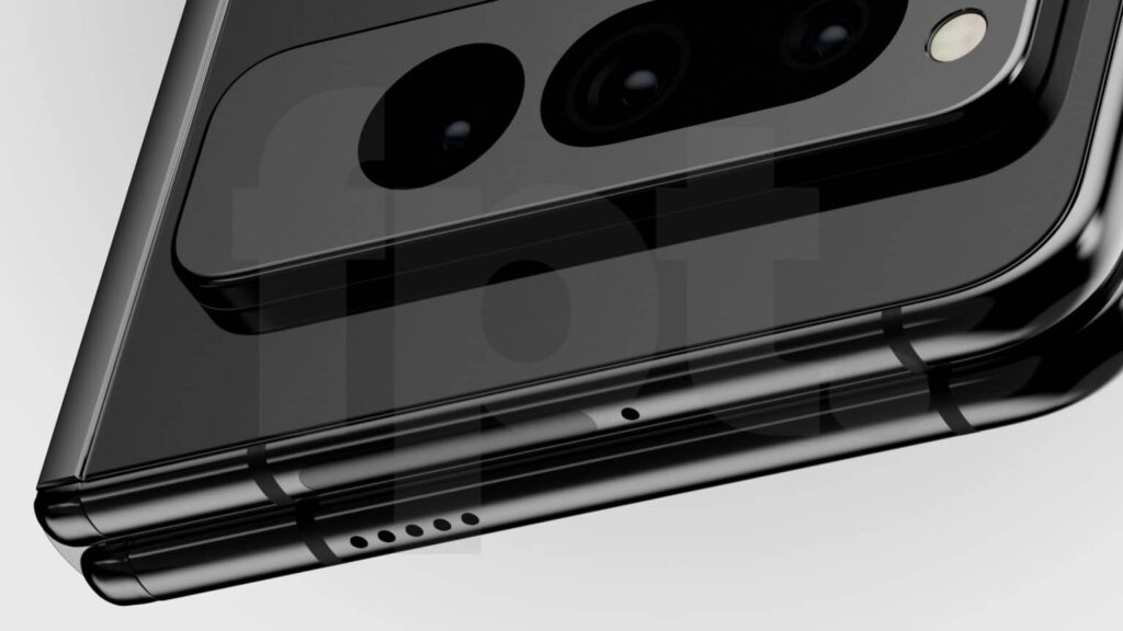 Las ilustraciones abundan y permiten visualizar al Pixel Fold desde diferentes ángulos. Notamos una parte posterior demasiado inspirada en el actual Pixel 7 Pro. Es más, detrás habría tres cámaras junto al flash LED con interfaz similar.