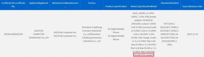 La certificación viene desde la agencia china 3C. En el listado se puede ver que el ROG Phone 8 Ultimate, con nombre clave ASUS_AI2401_A, ofrecerá las mismas velocidades de carga que sus predecesores de años anteriores.