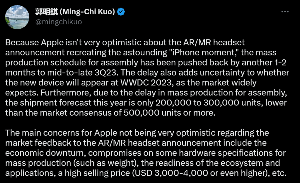 Además, Kuo dice que Apple no es para nada optimista con las perspectivas de mercado del dispositivo, sobre todo debido a su alto precio que podría llegar a los USD $.3000. Todo esto en medio de un entorno económico incierto actualmente.