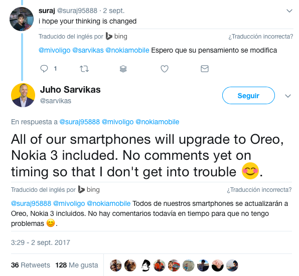 Pero gracias a una pregunta que le realizaron al CEO de HMD por Twitter — Juho Sarvikas — pudimos saber que todos los modelos de Nokia se actualizarán muy pronto a Android 8.0 Oreo.