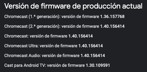 En la imagen superior podemos ver que el Chromecast de primera generación actualmente tiene el firmware 1.36.157768, mientras que el resto de los dispositivos superiores ya van en la versión 1.40.156414 si hablamos de versiones estables.