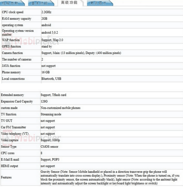 En cuanto a la cámara, esta sería 13 megapíxeles y una frontal de 4 megapíxeles contando con tecnología Ultrapixel. El terminal estaría basado en Android Lollipop 5.0.2, contaría con 16 GB de almacenamiento interno con capacidad de poder expandir la memoria mediante tarjetas microSD de hasta 128GB.