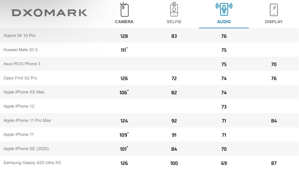 Actualmente, el primer lugar lo tiene el Xiaomi Mi 10 Pro con 76 puntos, mientras que en el segundo vemos al Huawei Mate 20 X y Asus ROG Phone 3 con 75 puntos, siguiendo en el cuarto lugar con el Oppo Find X2 Pro y el iPhone XS Max con 74.