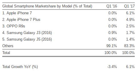 Según Strategy Analytics, Apple comanda la venta de teléfonos a nivel global, con el iPhone 7 llevándose un 6.1% de los dispositivos vendidos, mientras que su hermano mayor, el 7 Plus, se queda con el segundo puesto, con un 4.9% de envíos.