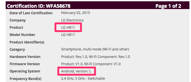 Como se puede ver en el documento el modelo del próximo teléfono de la compañía coreana es el LG-H810, además se puede ver que el dispositivo vendría con «Android L», más conocido como Android Lollipop actualmente.