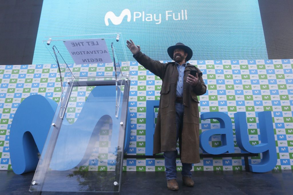 Esta mañana quienes estaban cerca de la Torre Telefónica, fueron testigos privilegiados de la llegada del famoso Chuck Norris quien aterrizó en el lugar para presentar el nuevo servicio de la compañía llamado Movistar Play Full.