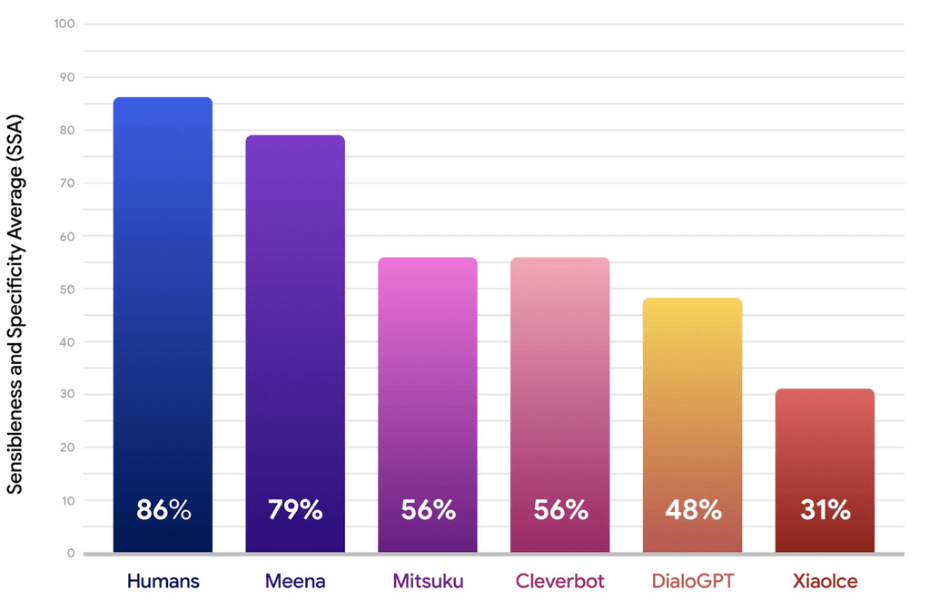 En este aspecto, los humanos evaluados obtuvieron un 86%, mientras que Meena obtuvo un 79% — el más alto de todos los bots conversacionales evaluados.