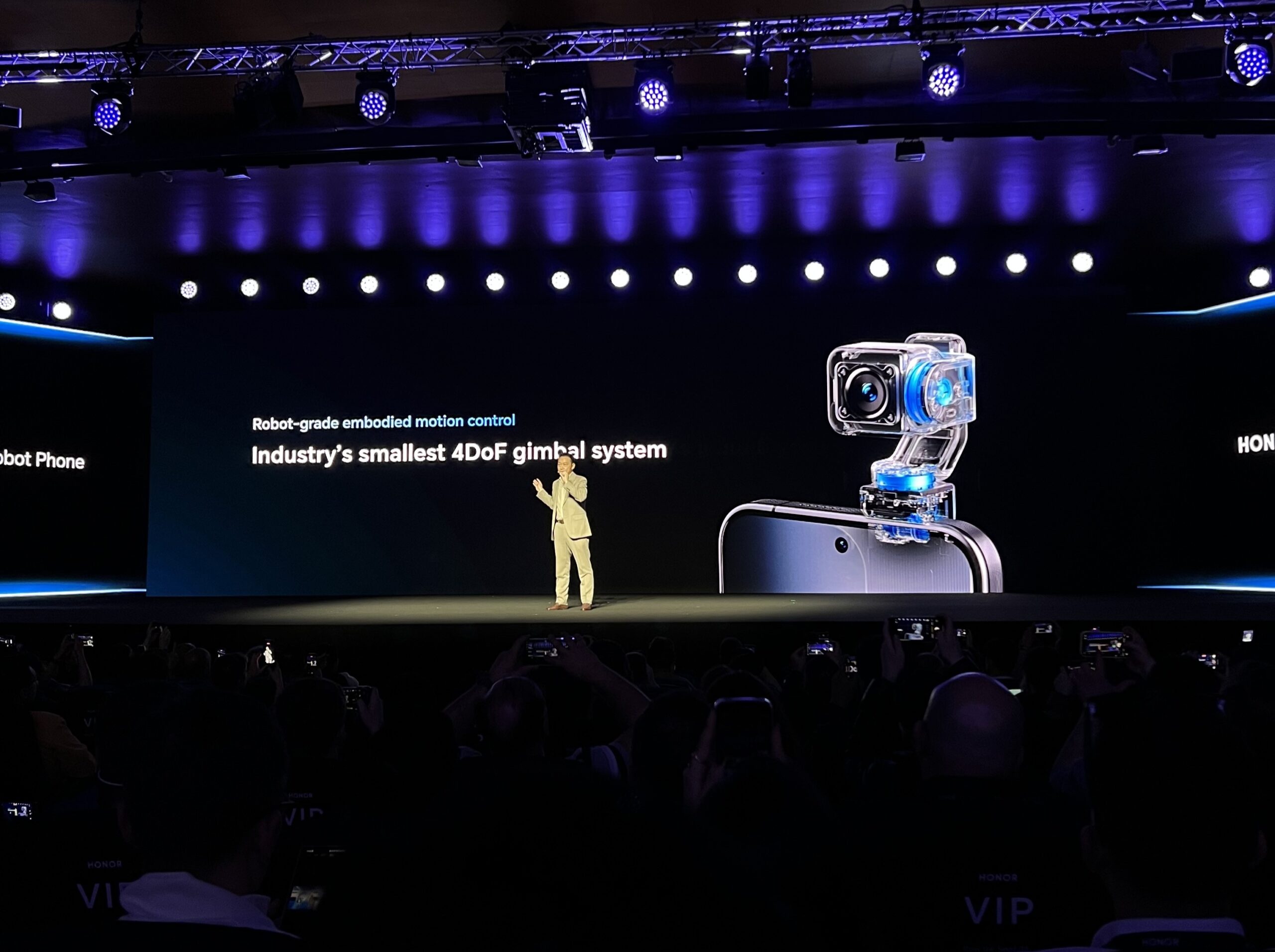 El elemento más innovador del equipo es la incorporación de un gimbal robótico oculto que se despliega de forma sencilla. Esto permite que la cámara principal del teléfono se mueva, estabilice y encuadre automáticamente la grabación de video sin intervención humana. El sistema puede seguir sujetos, reducir vibraciones y ajustar el enfoque de forma autónoma.