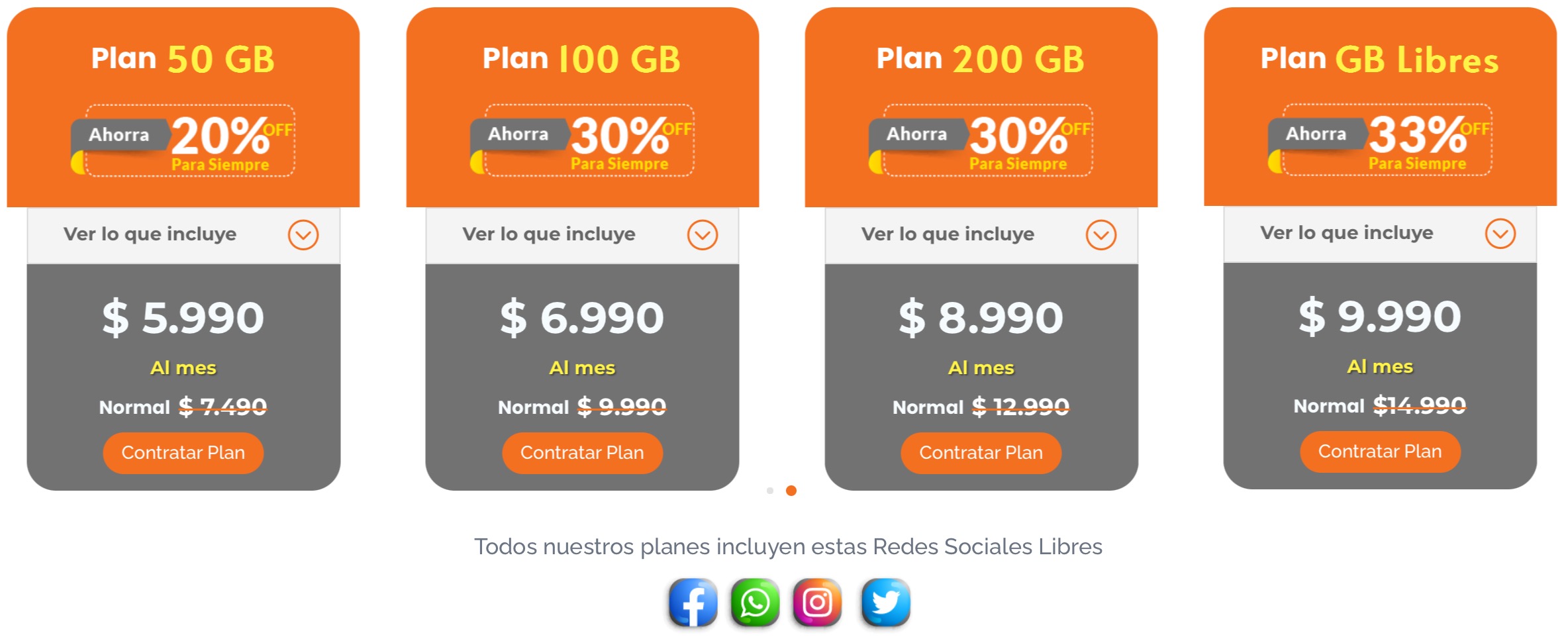 Por otro lado, el plan más caro ofrece “Gigas libres”, 150 SMS, minutos libres y acceso libre a Facebook, WhatsApp, Instagram y Twitter. El precio normal es de $14.990, pero por oferta de lanzamiento, tienes 33% de descuento para siempre, por lo que tu plan quedaría en $9.990.