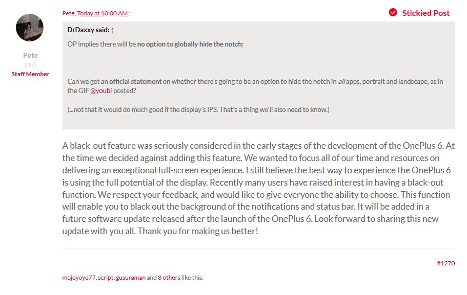 Pero ahora, el otro fundador de la empresa, Pete Lau, ha salido a confirmar lo que muchos esperaban, y es que en los foros oficiales de OnePlus se ha validado que el equipo dejará enmascarar por software este notch, aumentando, eso sí, el borde superior del equipo.