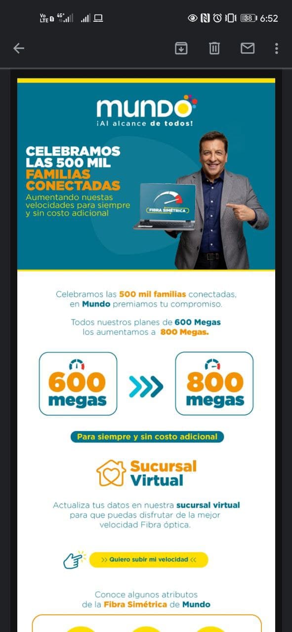 Eso nos han reportado en redes sociales nuestros lectores, quienes nos comentan que recibieron un email informando sobre el aumento de velocidad que recibieron en su servicio de internet hogar de Mundo.