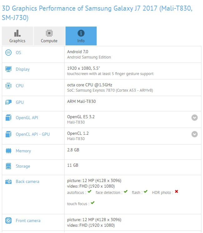 Hoy, mediante GFXBench podemos ver que el Galaxy J7 (2017) llegará con una pantalla de 5,5 pulgadas con resolución FHD, un procesador Qualcomm Snapdragon 625 o Exynos 7870, dependiendo de la región, junto con 3GB de memoria RAM y 16GB de almacenamiento interno.