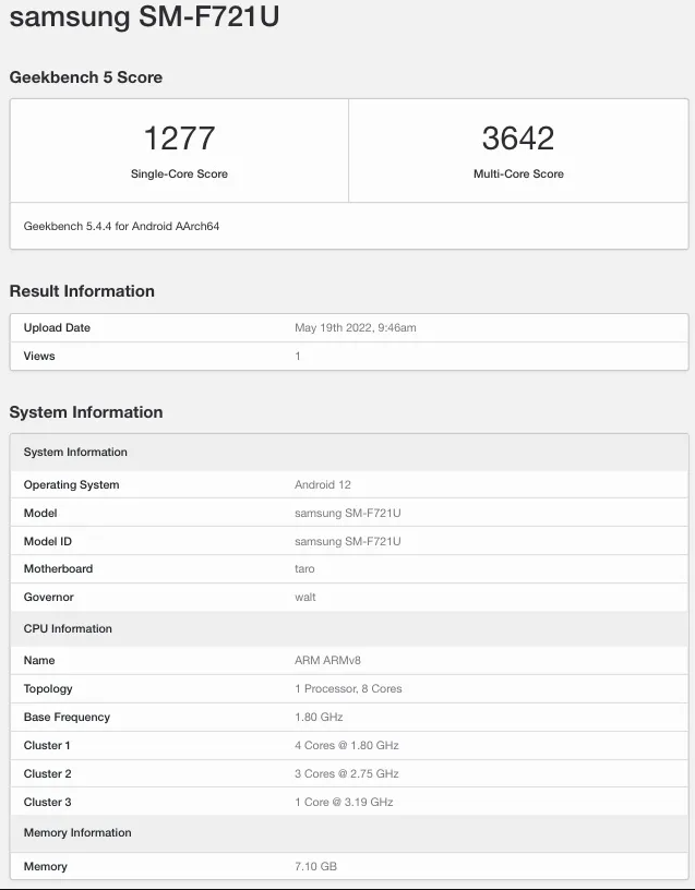 Y precisamente de él tenemos nueva información, ya que fue visto en la plataforma de benchmarks llamado Geekbench en donde quedó registrado el dispositivo que se identifica con el modelo SM-F721U, la variante dedicada para Estados Unidos.