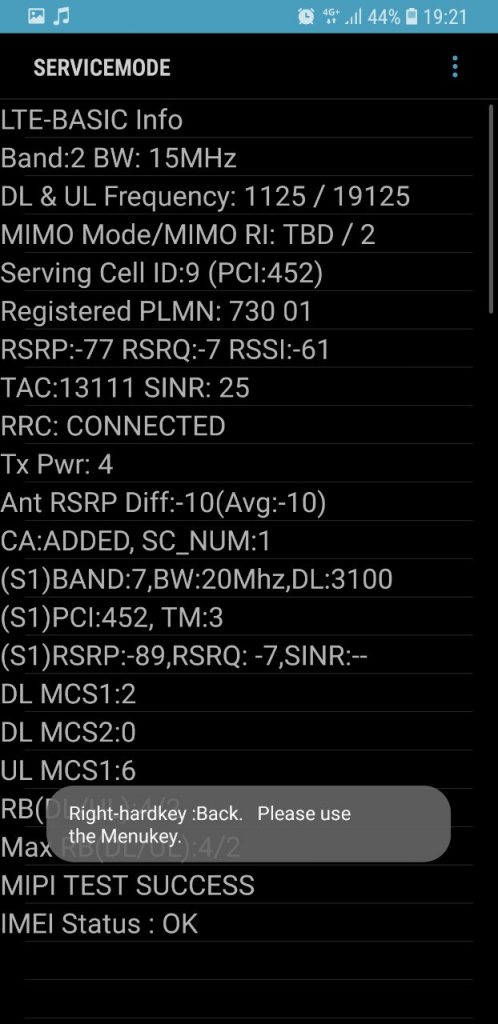 Quisimos ver a qué red 4G estábamos conectados cuando presenciamos esta velocidad y pudimos ver que nuestro equipo estaba haciendo Carrier Aggregation con la banda 2600 y 1900MHz, tal cual como lo demuestra la siguiente captura: