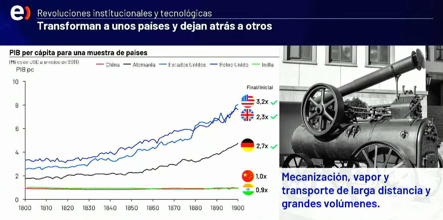 Para ilustrar este punto, presentó un análisis histórico de revoluciones tecnológicas pasadas —desde la mecanización hasta la informática— que evidenció cómo los países que se adaptaron multiplicaron varias veces el bienestar de su población, mientras otros quedaron rezagados.