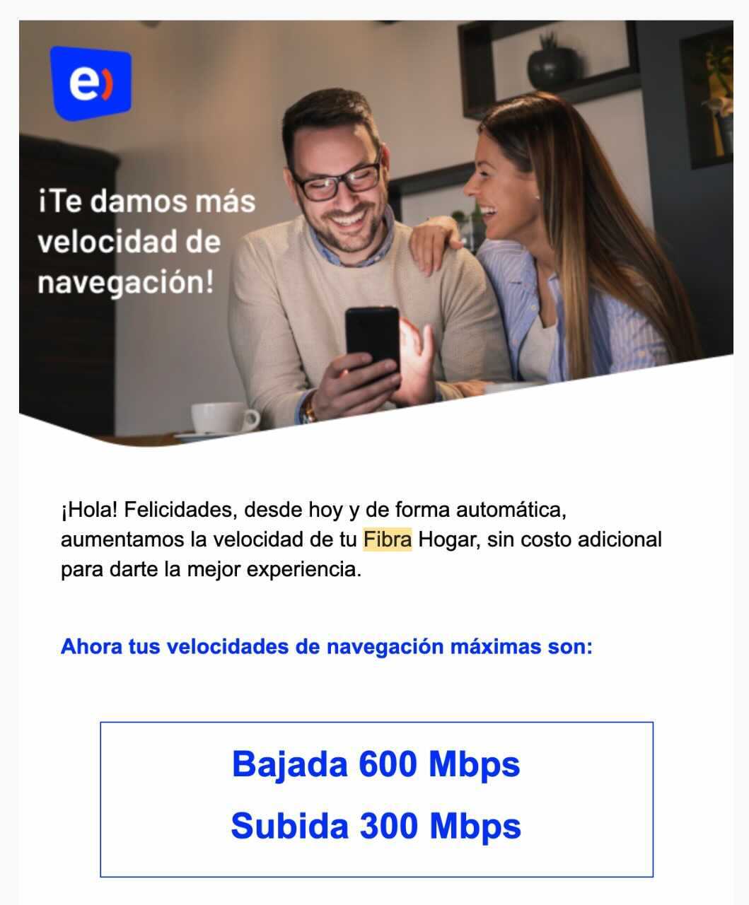 No sabemos muy bien si esto aplica para todos los clientes o solo para algunos, pero sabemos que están recibiendo un email en donde Entel les informa que su velocidad de su plan Fibra Hogar ha aumentado.