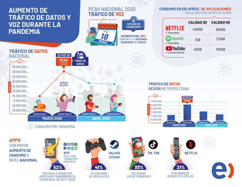 En cuanto a consumo de voz, el tráfico de esta aumentó un 28,4%, registrando su peak el 18 de marzo, día en que se decretó Estado de Catástrofe.