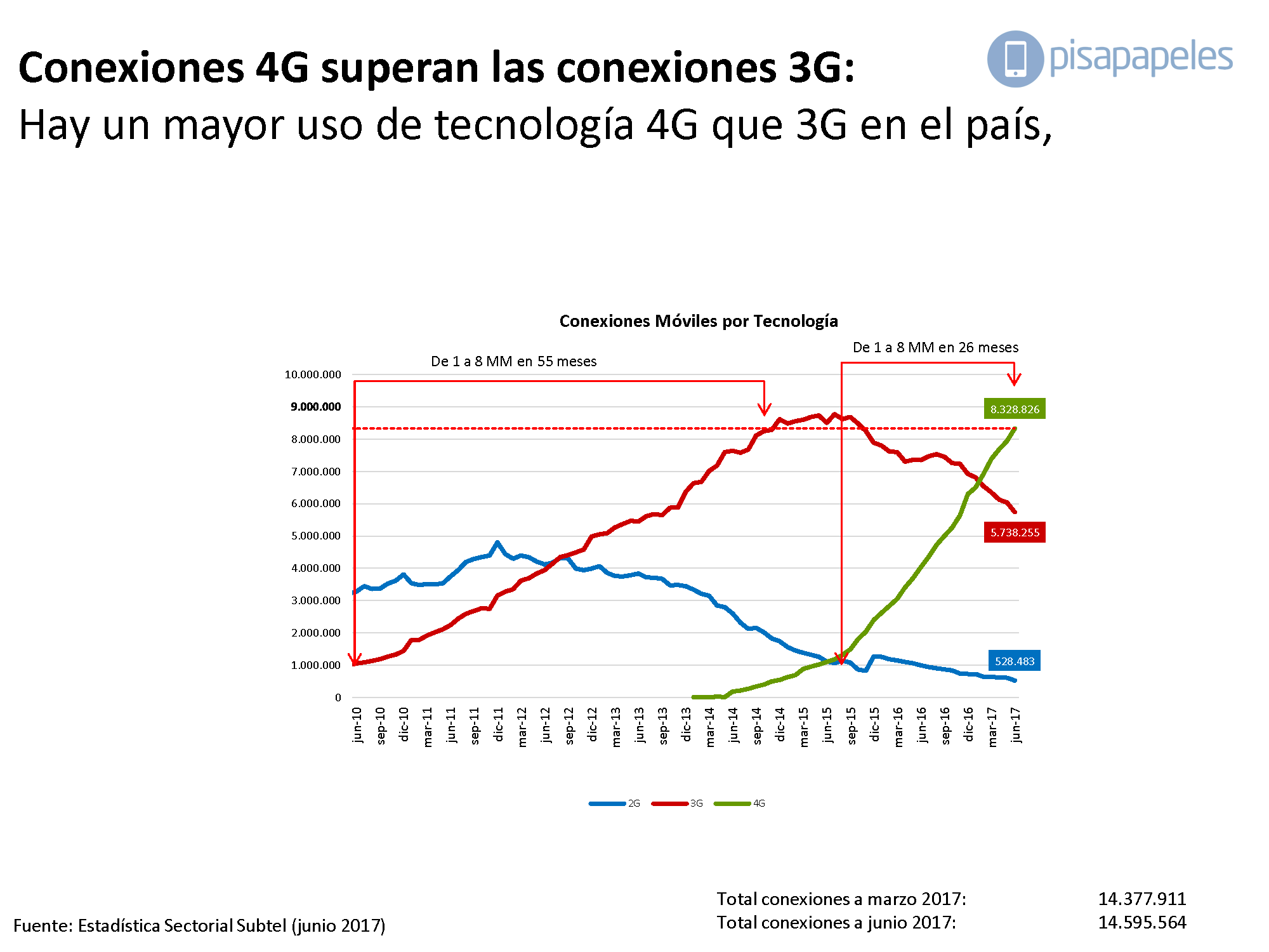 El gráfico anterior muestra que la expansión del 3G fue mucho más lenta que la del 4G. Es decir, en 55 meses se alcanza los 8 millones de usuarios de 3G entre junio de 2010 y septiembre de 2014. En cambio, el 4G alcanzó los 8 millones de usuarios en tan solo 26 meses, generando un crecimiento mucho más explosivo.