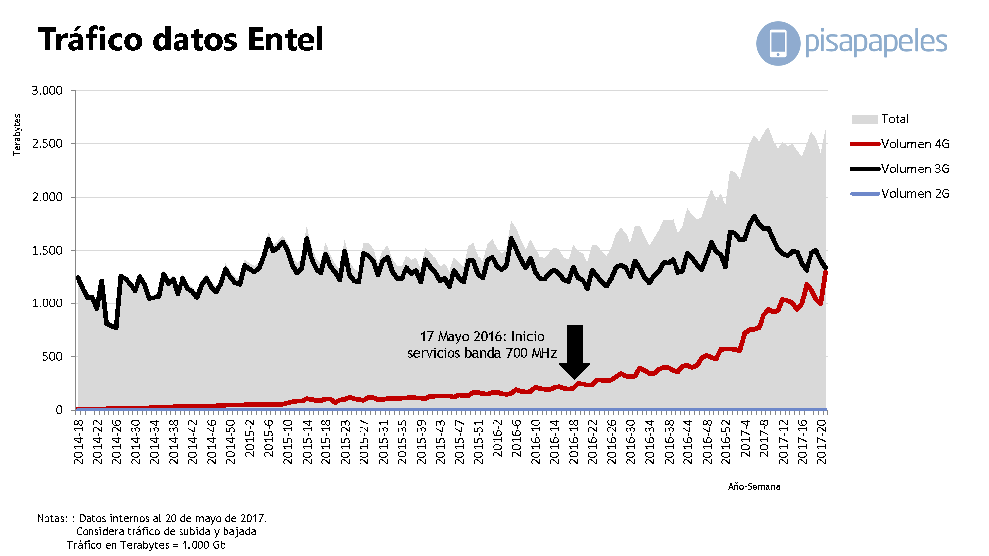 De acuerdo a lo anterior, Se puede observar que la línea negra (uso de datos en 3G) bordea el fondo gris, es decir, el uso de datos de 3G en Entel ocupaba prácticamente todo el ancho de banda hasta el despliegue de la red 700MHz.
