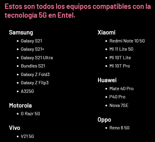 Por el momento, el operador está ofreciendo acceso 5G en equipos Samsung, Xiaomi, Motorola, Oppo, y Vivo.