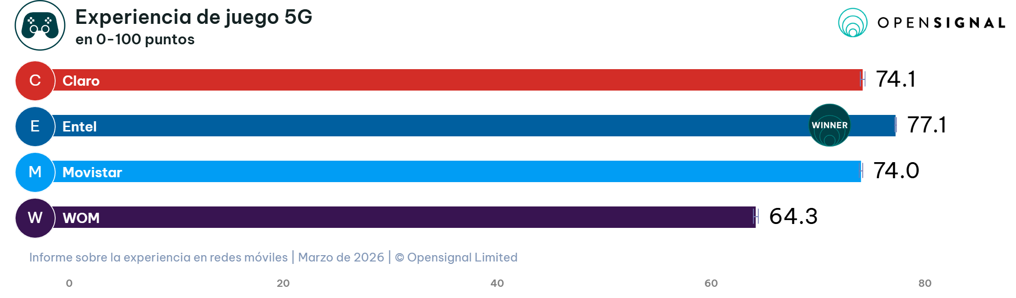 Respecto a las escalas de calidad definidas por Opensignal, Entel es el único operador en obtener una calificación de rendimiento «Bueno». Movistar y Claro se sitúan en el rango de “Aceptable”, mientras que la conectividad de WOM para el gaming 5G recibe la categoría de “Deficiente”.