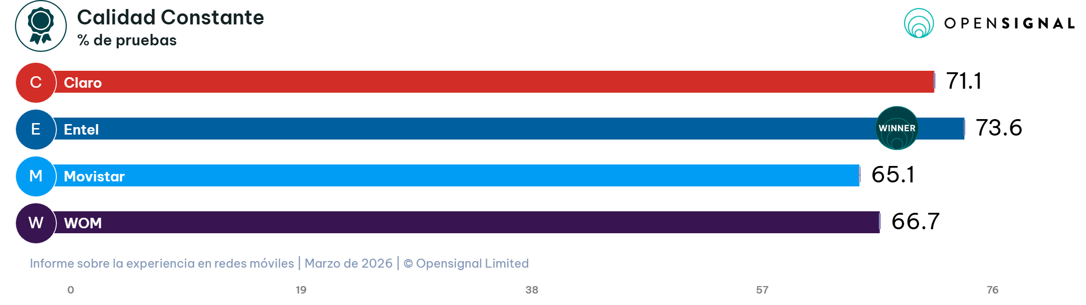 La competencia en este apartado es muy estrecha, ya que Movistar (74,2 puntos) y Claro (74,1 puntos) se ubican prácticamente empatados en el segundo lugar, a poco más de un punto de diferencia del líder. En la cuarta posición se encuentra WOM con 71,1 puntos. A pesar de estas variaciones, el reporte de Opensignal destaca que el desempeño de los cuatro operadores es lo suficientemente alto para situarlos en la calificación de rendimiento “Muy bueno”.