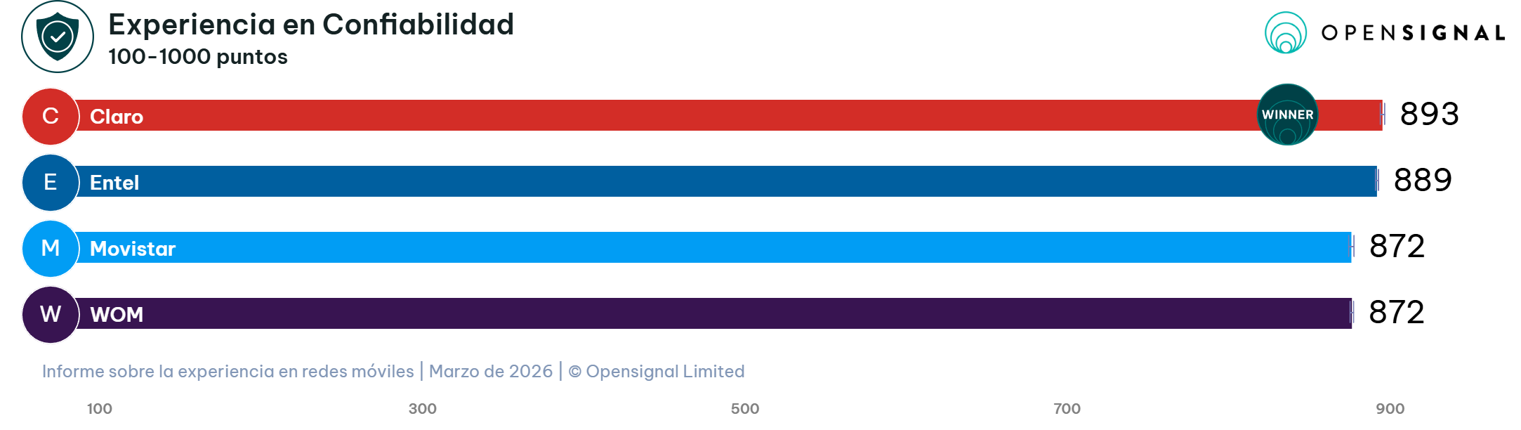 En la categoría de Experiencia en confiabilidad, la teleoperadora Claro se adjudica el primer lugar al alcanzar 893 puntos sobre una escala de 1000. Esta métrica evalúa la capacidad de los usuarios para conectarse a la red y completar con éxito tareas cotidianas, tales como navegar por la web, realizar llamadas de voz a través de aplicaciones o reproducir video en resolución estándar (SD).
