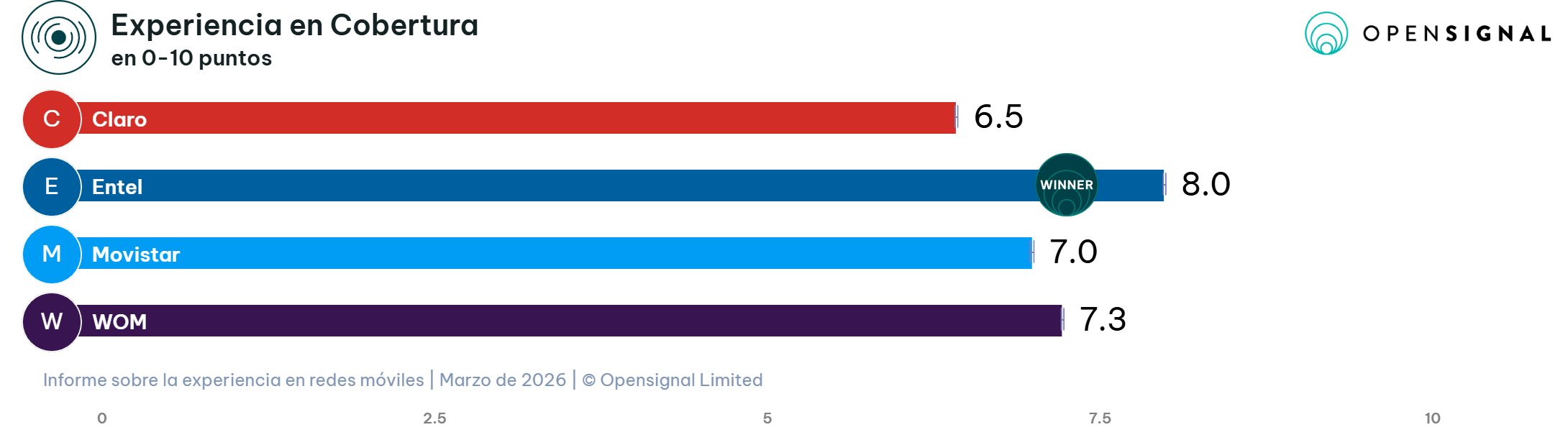 Entel obtiene el primer lugar en la categoría de Experiencia en cobertura al alcanzar una puntuación de 8,0 sobre una escala de 10. Esta métrica evalúa el alcance de las redes móviles en los lugares donde los usuarios viven, trabajan y se desplazan habitualmente, buscando reflejar la disponibilidad de señal en escenarios reales por sobre las estimaciones geográficas tradicionales.