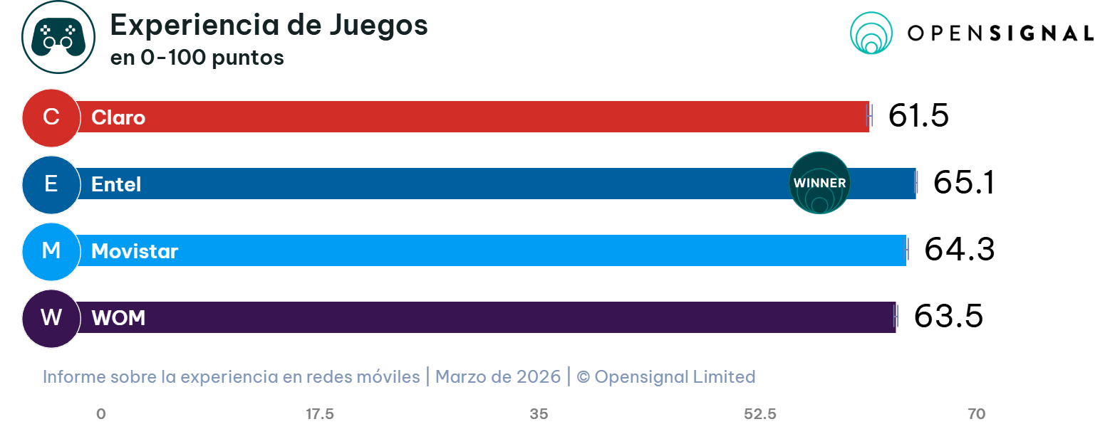 Entel encabeza la categoría de Experiencia de Juegos con 65,1 puntos, un indicador clave que mide el impacto de la latencia, la pérdida de paquetes y el jitter en títulos multijugador móviles. Movistar lo sigue de cerca en segundo lugar con 64,3 puntos, superando a WOM (63,5) y Claro (61,5).