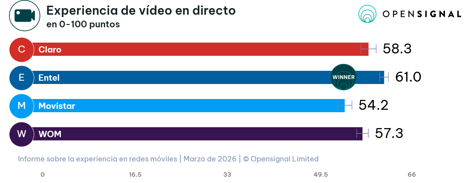 Entel se adjudica el primer lugar en la categoría de Experiencia de video en directo con una puntuación de 61,0 sobre 100. Este indicador refleja su capacidad superior para gestionar la transmisión de contenido en tiempo real, garantizando una reproducción fluida y con menos interrupciones para los usuarios móviles.