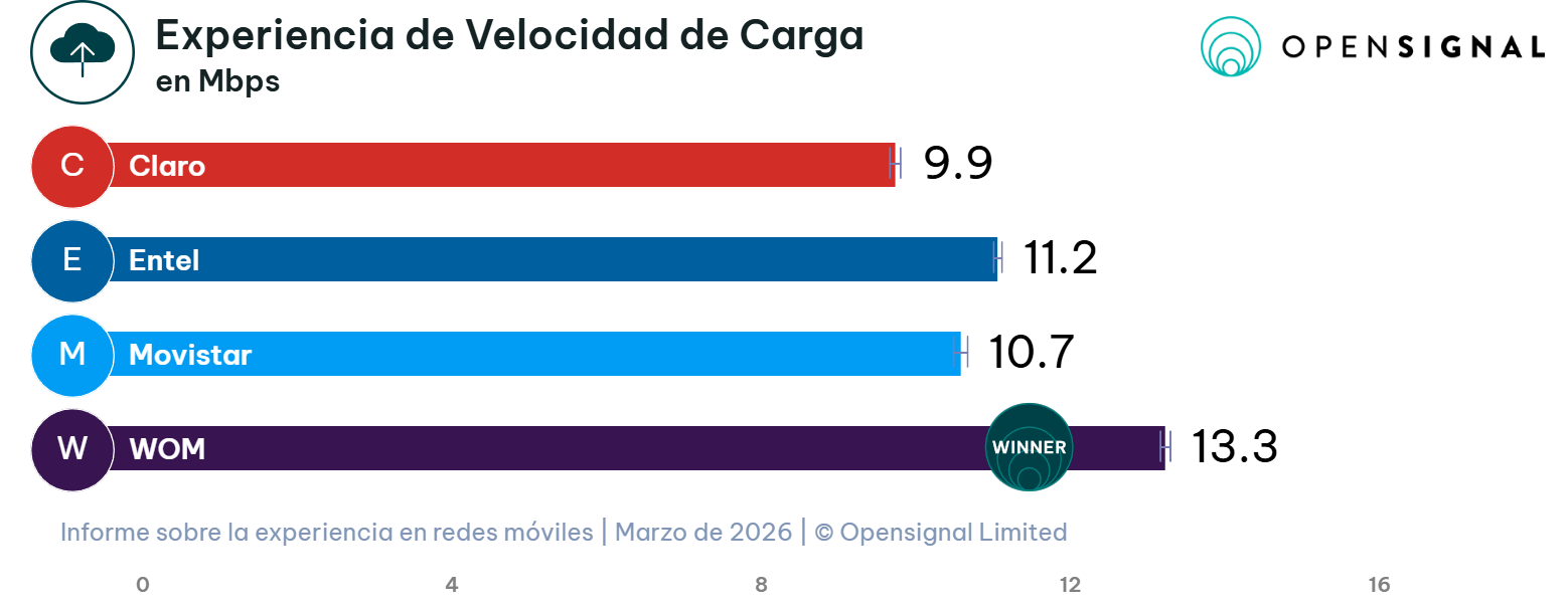WOM obtiene el primer lugar en la categoría de Experiencia de velocidad de carga, registrando un promedio de 13,3 Mbps. Como destaca el reporte, esta métrica cobra cada vez más relevancia en el escenario actual, donde los usuarios demandan mayor capacidad de subida para la creación de contenidos y el uso de servicios de comunicación en tiempo real.