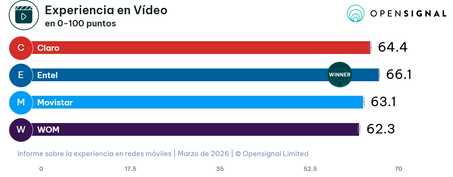 Entel conserva el primer lugar en la categoría de Experiencia en Video, alcanzando una puntuación de 66,1 sobre 100. Este resultado confirma su ventaja en la calidad de transmisión que perciben los usuarios al reproducir contenidos multimedia en sus dispositivos móviles a través de redes generales.
