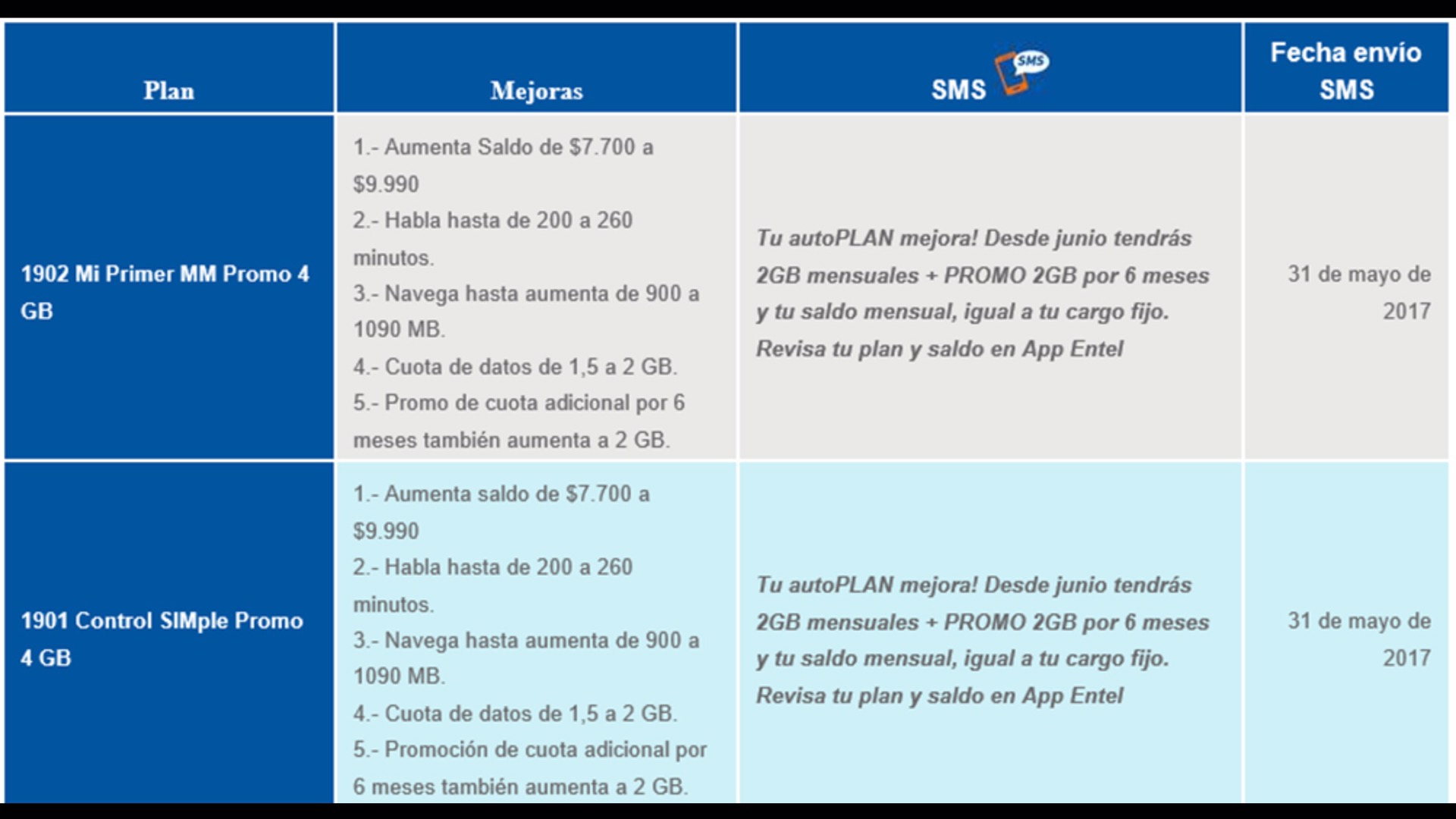 En un comienzo este plan contaba con 1,5GB de datos + WhatsApp ilimitado + 1,5GB adicional durante 6 meses y $7.700 de saldo por $9.990 mensuales. Sin embargo, a partir de mañana 1 junio el plan sufrirá una mejora, ya que ahora pasarás a tener 2GB de datos móviles + WhatsApp ilimitado + 2GB adicionales por 6 meses y $9.990 de saldo pagando exactamente lo mismo.