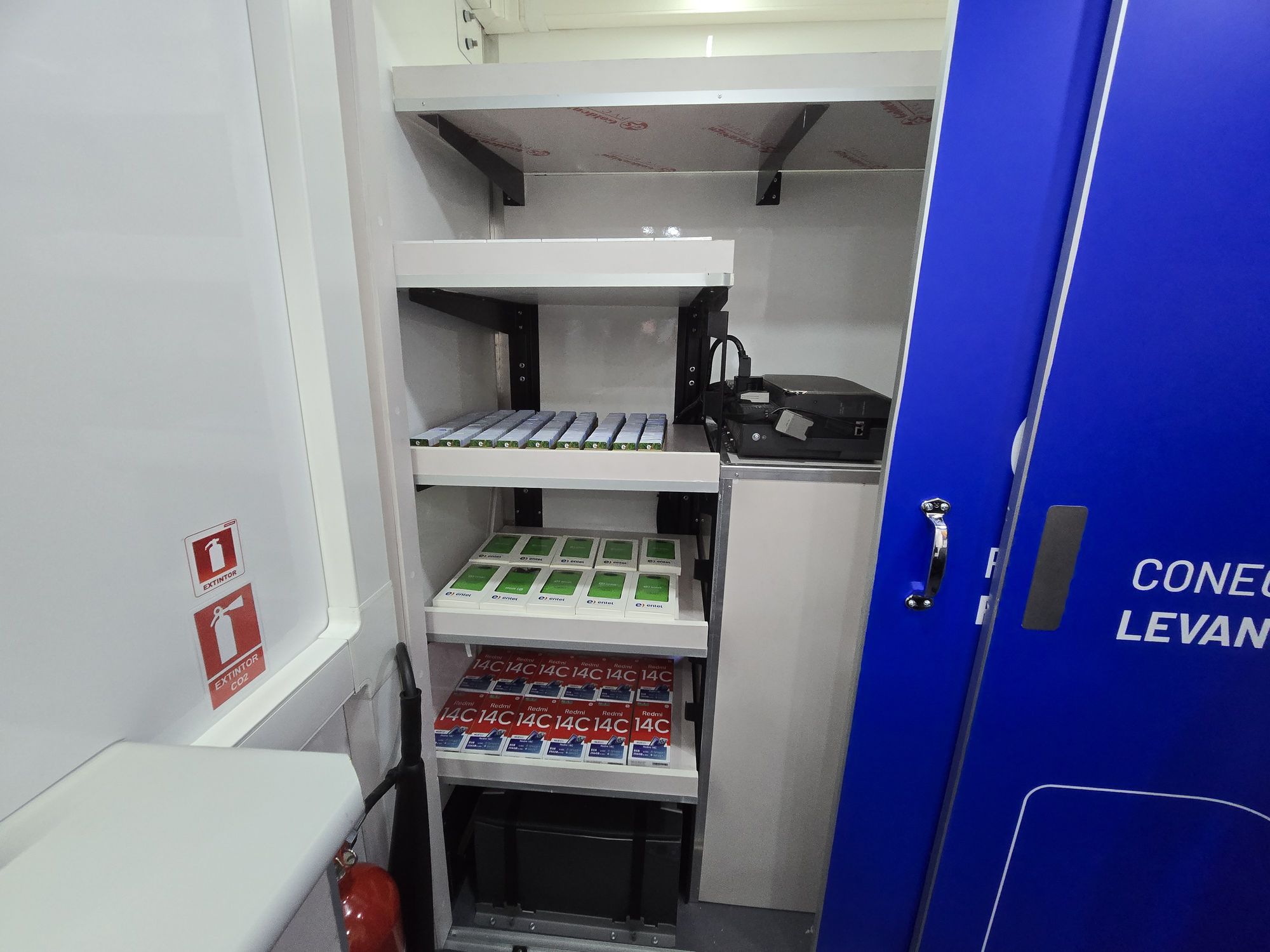 En su interior, el camión cuenta con una oficina para gestionar las emergencias, con una pequeña bodega con muchas IM cards y dispositivos de reposición para personas afectadas.